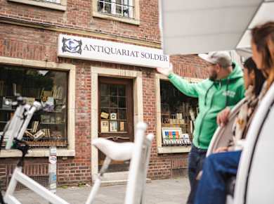 MünsterDie Geschäfts- und Flaniermeile mit Cafés und Restaurants erstreckt sich vom Historischen Rathaus im Süden bis zur Lambertikirche im Norden. Die Einheimischen nennen sie liebevoll ›Gute Stube‹. Sie ist gesäumt von malerischen Giebelhäusern mit Bogengängen, die größtenteils nach dem Zweiten Weltkrieg mit heimischen Baustoffen, u.a. Baumberger Sandstein, im historisierenden Stil wieder aufgebaut wurden.